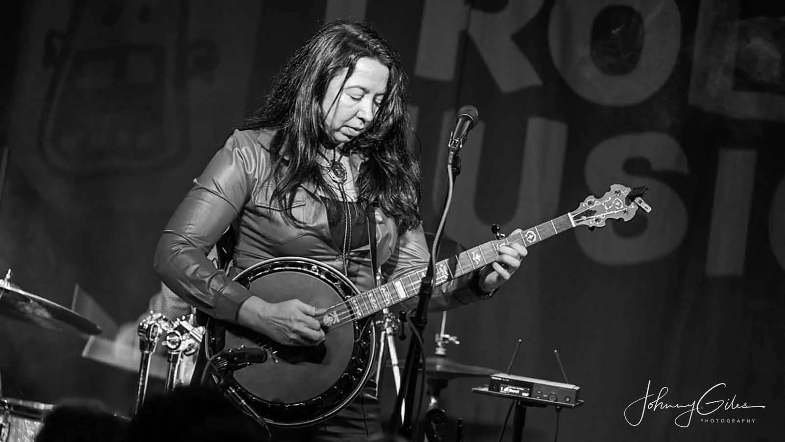 Mean Mary locks into a driving banjo line under cool blue stage lights, focused and fully in command of the moment.